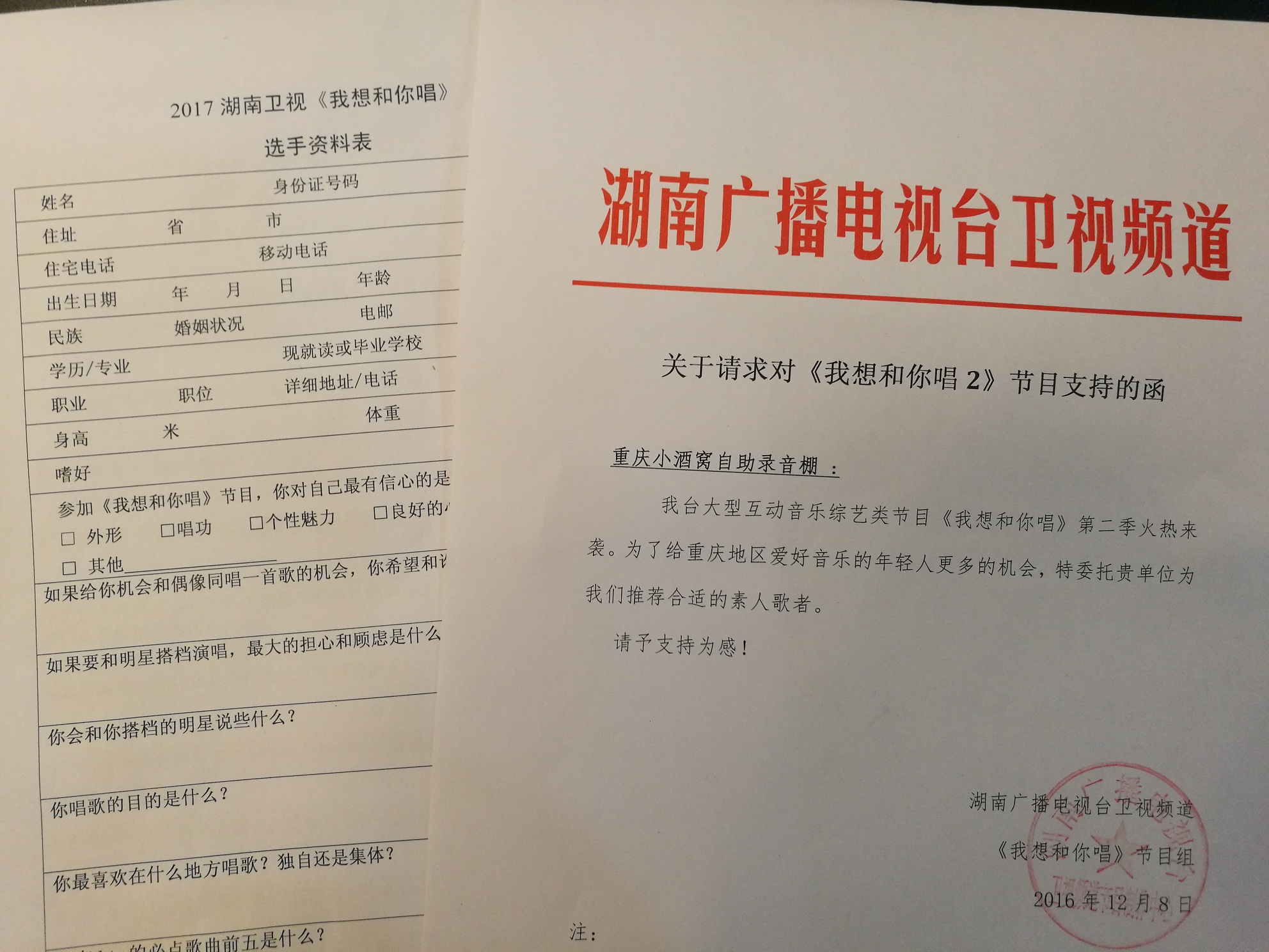 2016年12月21日 小酒窝录音棚为了给重庆地区爱好音乐的年轻人更多的机会,2016年12月8日,湖南卫视《我想和你唱》节目组给小酒窝录音棚发来了“关于请求对《我想和你唱2》节目支持的函”,委托小酒窝录音棚为栏目组推荐合适的选手。
